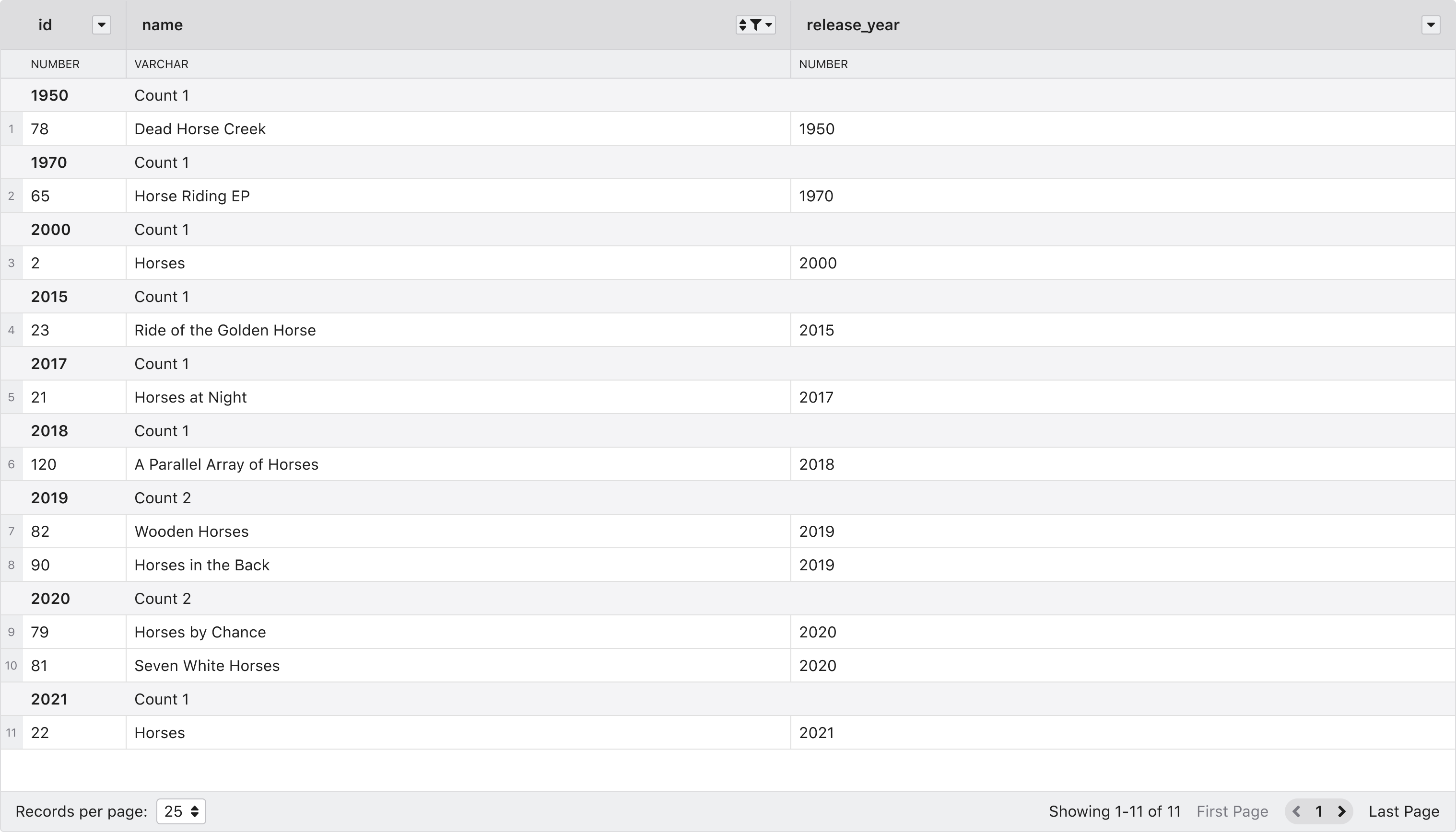 When a column groups a table, there are grouping elements added to separate the rows. A count of records for each group is available.