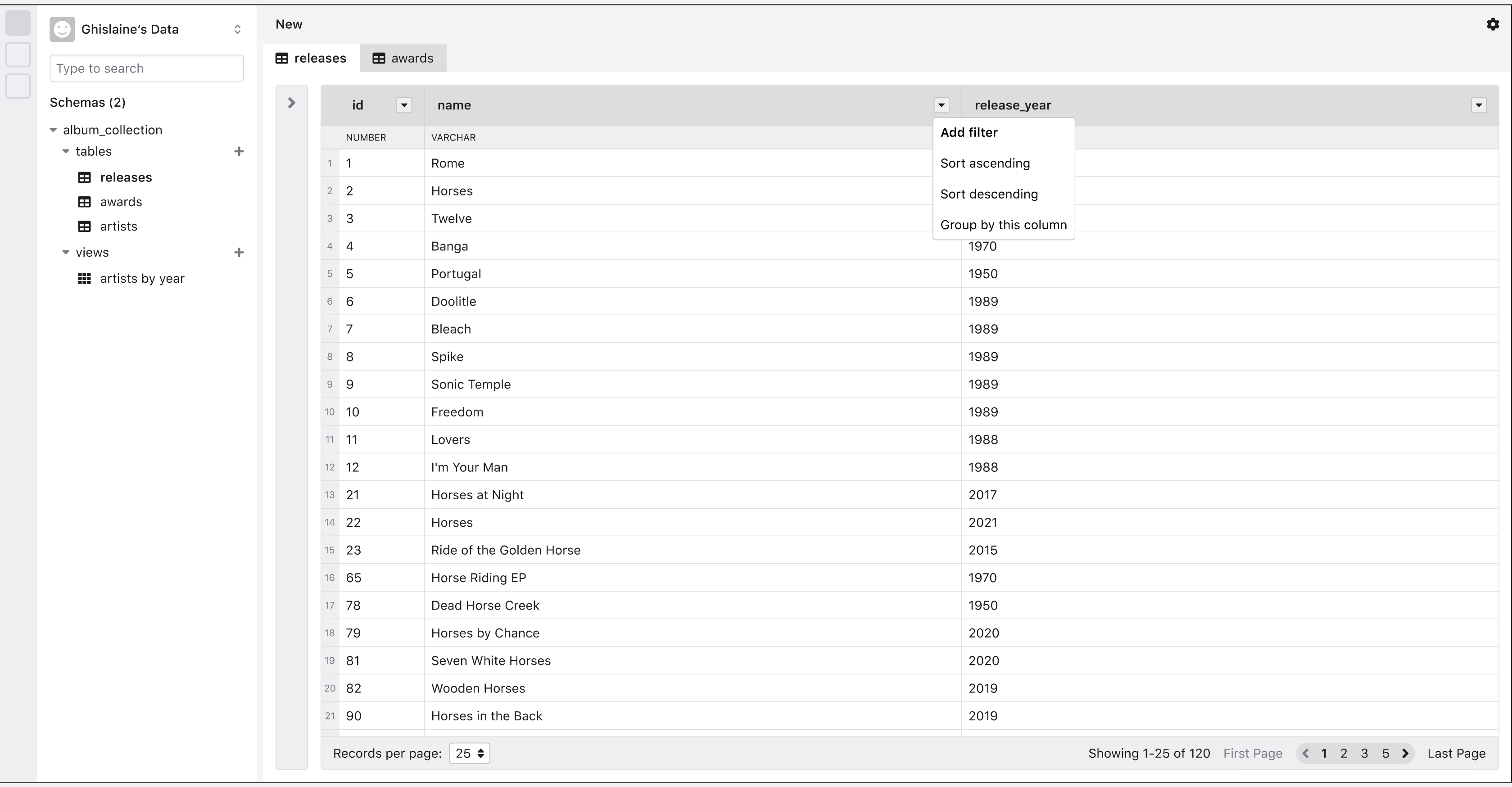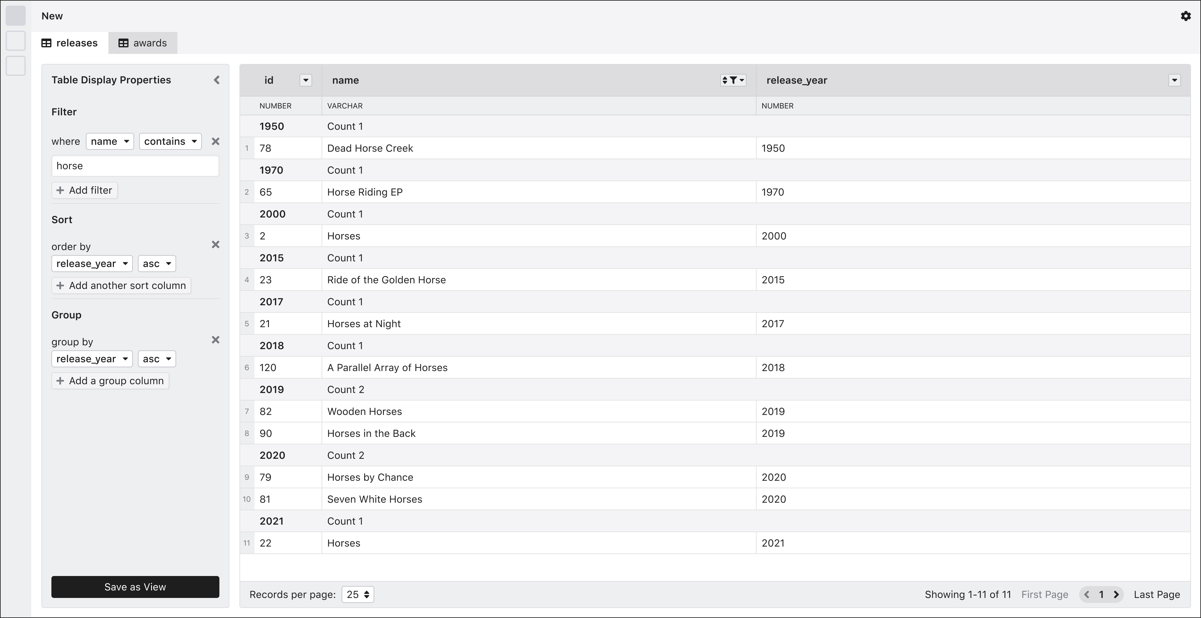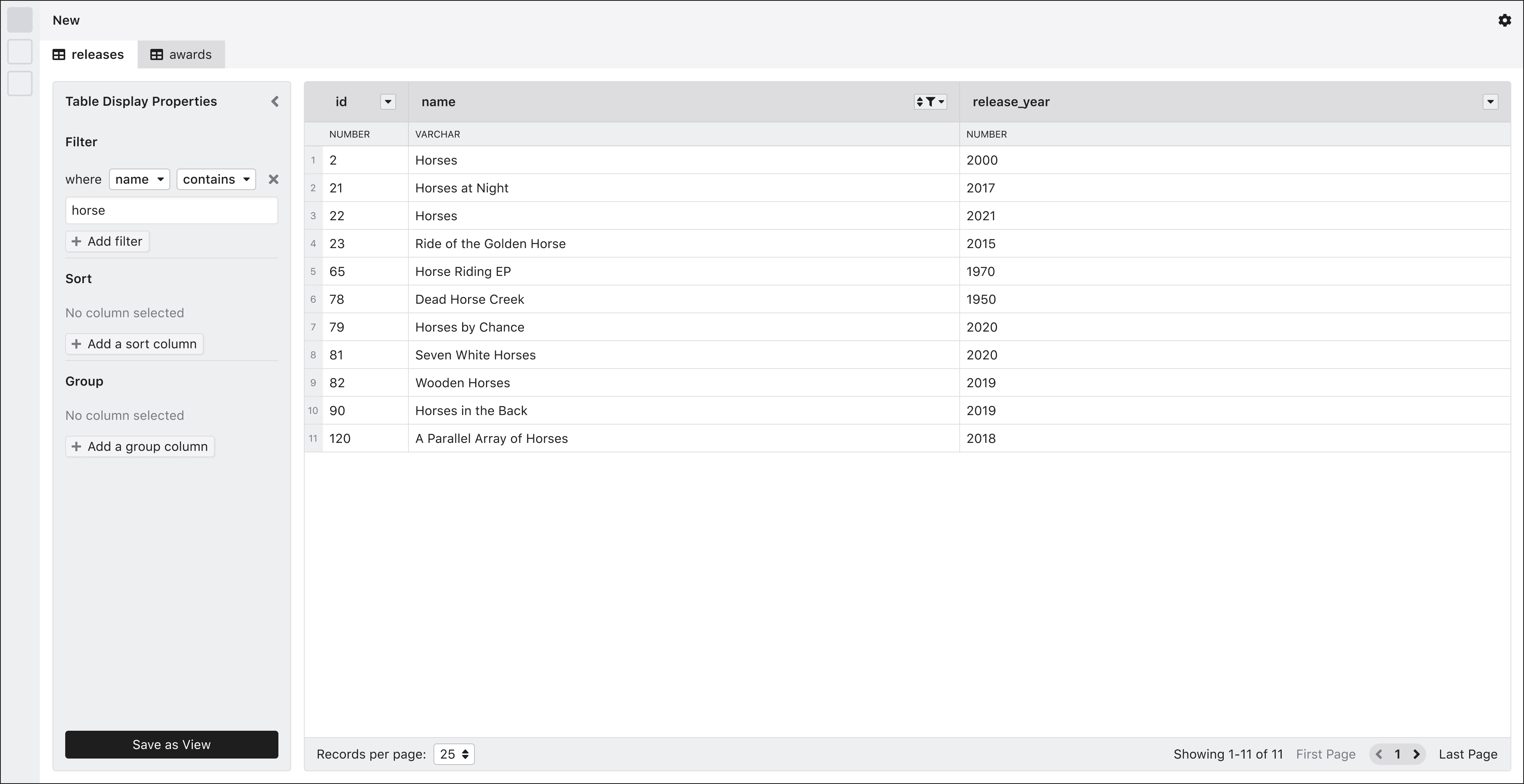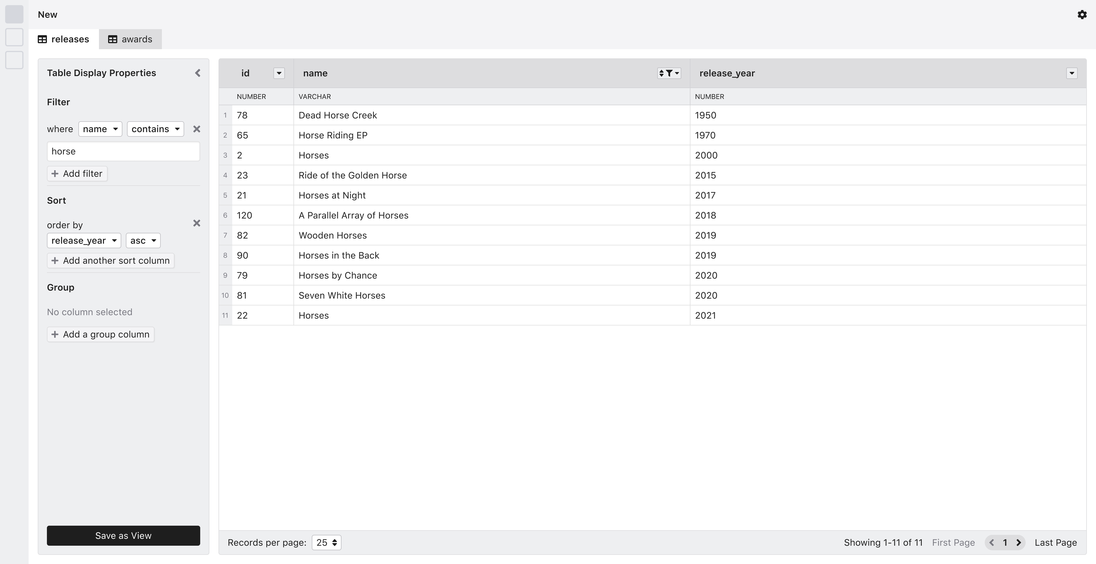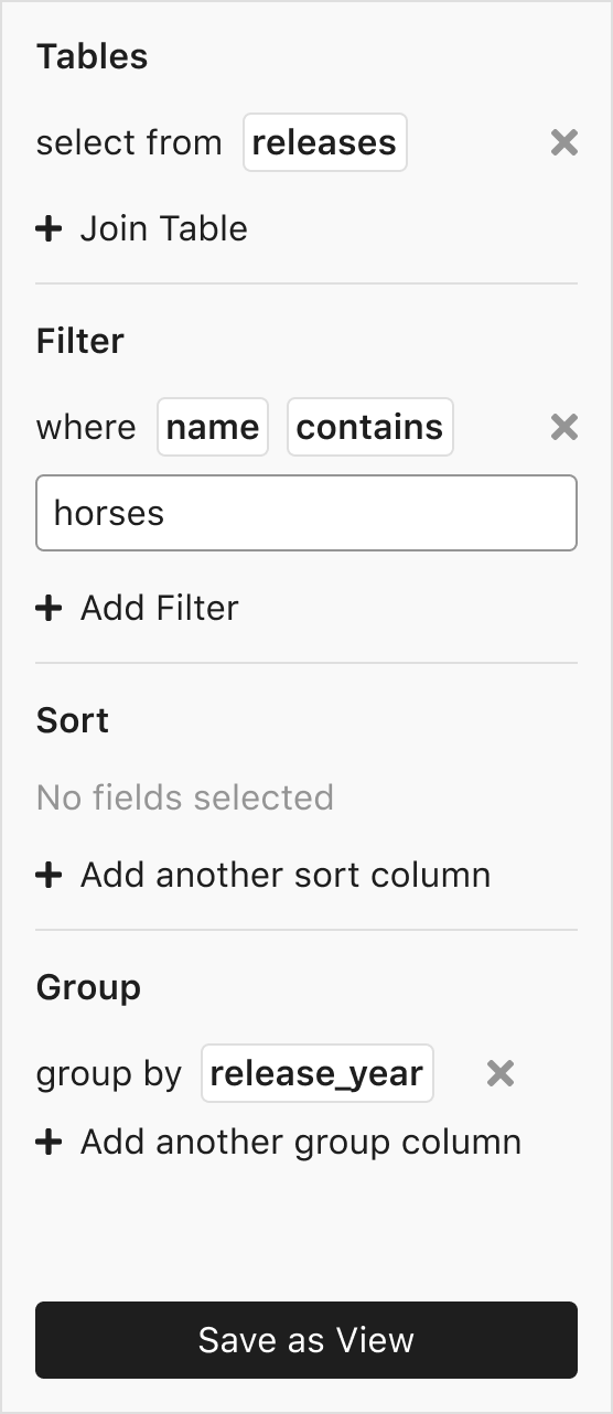 It is likely that when users think of filtering, sorting, or grouping data, they want to be able to perform these operations on multiple tables at the same time. At the time of this writing, view objects are not implemented in Mathesar; however, we have included them in the roadmap.