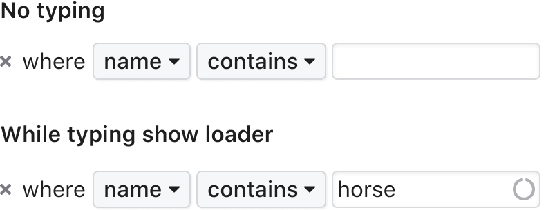 The table should refresh its content based on criteria entered by the user. The input controls should include a loading state that displays after after each keypress. A delay can be set so that the user can type full words without triggering constant reloads.