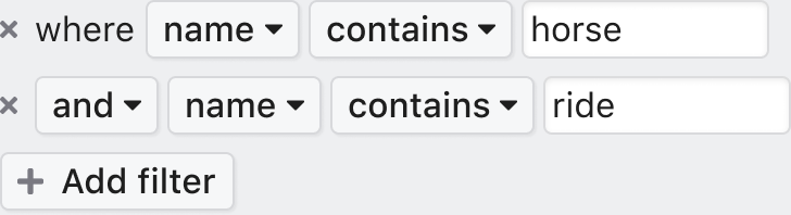 The default filter value is empty. The filtering condition is set to “contains” due to the field type.