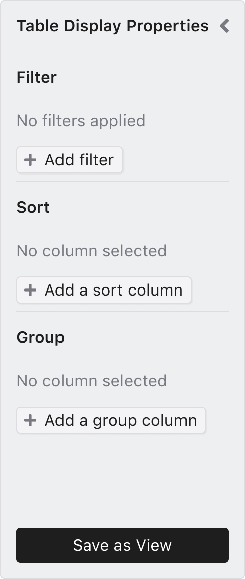 The table properties panel contains the properties of the active table. It opens automatically whenever a new property is added, for example, when applying a new filter from one of the column headers. When closed, the panel stays next to the table in a minified state. It can be reopened if necessary by clicking on it.