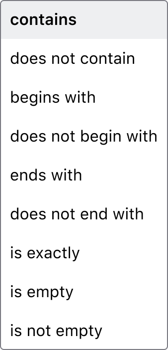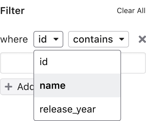 Once the column is set, users can also modify the different filter options. The set of options will depend on the data type of the selected option. If the column is changed to another data type, the UI update with different filter options, and the first one on the list will be chosen by default.